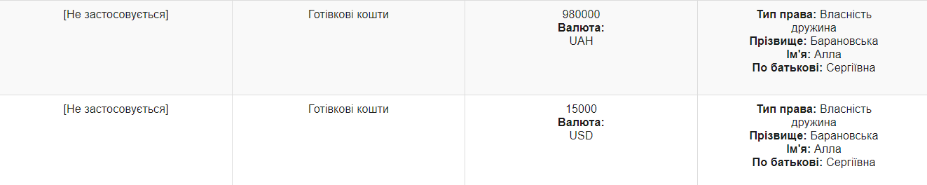 Дружина парламентаря Алла Барановська зберігає готівкою 980 тисяч гривень і 15 тисяч доларів.