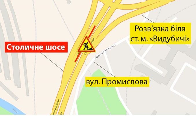 С 3 до 7 июня (ориентировочно) на Столичном шоссе специалисты «Киевтеплоэнерго» будут ремонтировать трубопровод (к работам приступают в ночь на 3 июня). Сроки могут измениться, так как после разрытия можно будет установить масштаб работ, во время которых ограничат движение на двух крайних левых полосах. Работать тепловики будут возле развязки и станции метро «Выдубичи» в направлении выезда из города.