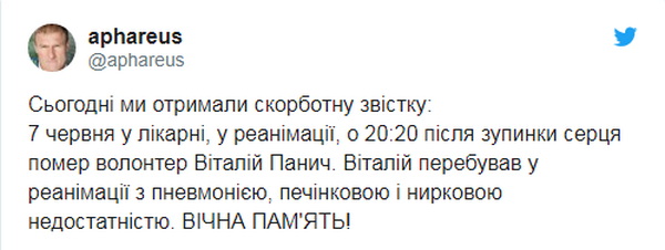В воскресенье, 7 июня, в Киеве умер волонтер Виталий Панич. Об этом в Twitter сообщил блогер aphareus.