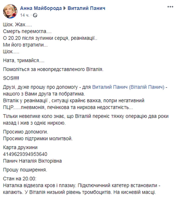 Коллега волонтера Анна Майборода за полчаса до кончины объявила сбор средств на лечение Панича.