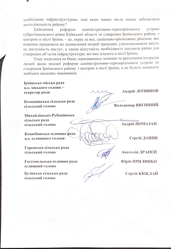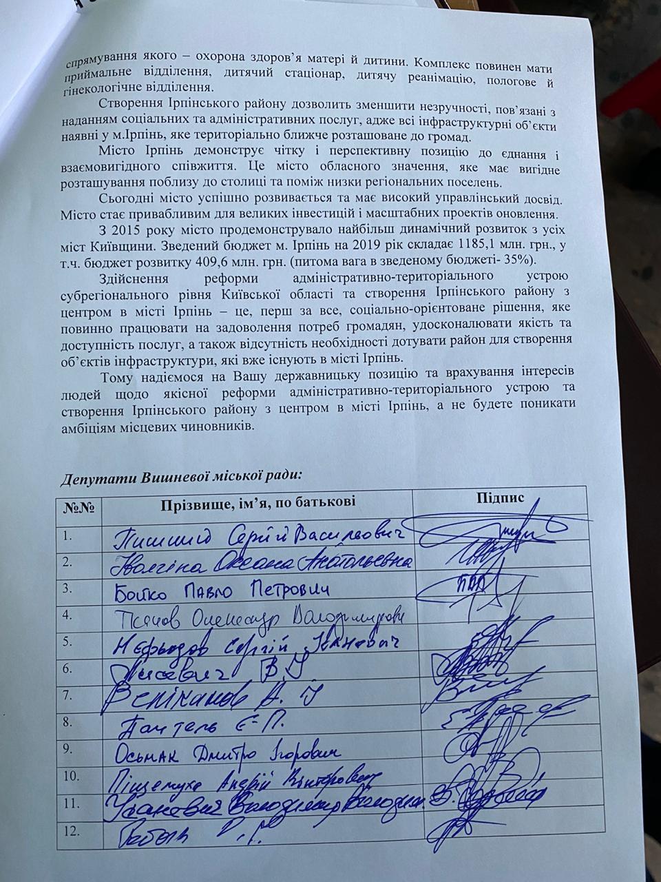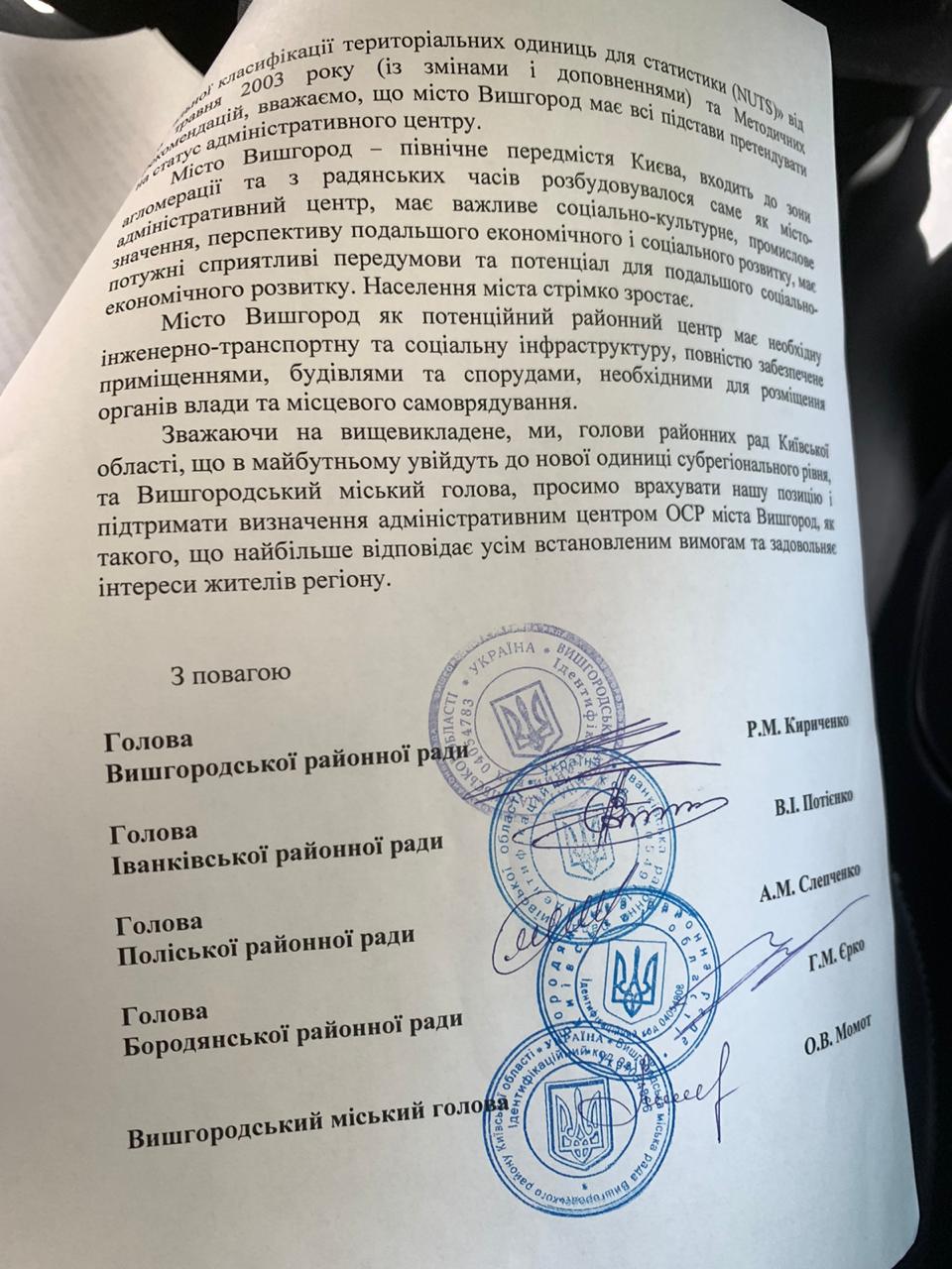 Разом з тим, у своєму відкритому листі голова Вишгородської районної ради Ростислав Кириченко, голова Іванківської районної ради Валерій Потієнко, голова Поліської районної ради Андрій Слепченко, голова Бородянської районної ради Георгій Єрко, Вишгородський міський голова Олексій Момот теж не бачать Бучу районним центром, а пропонують, щоб центром Ірпінського району був у місті Вишгород.