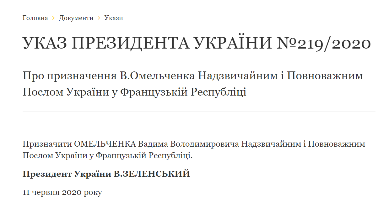 “Уволить Шамшура Олега Владиславовича с должности чрезвычайного и полномочного посла Украины во Французской Республике и с должности постоянного представителя Украины при ЮНЕСКО по совместительству”, – говорится в документе.