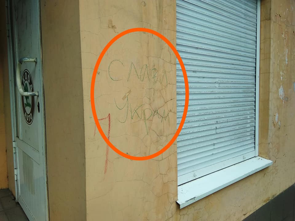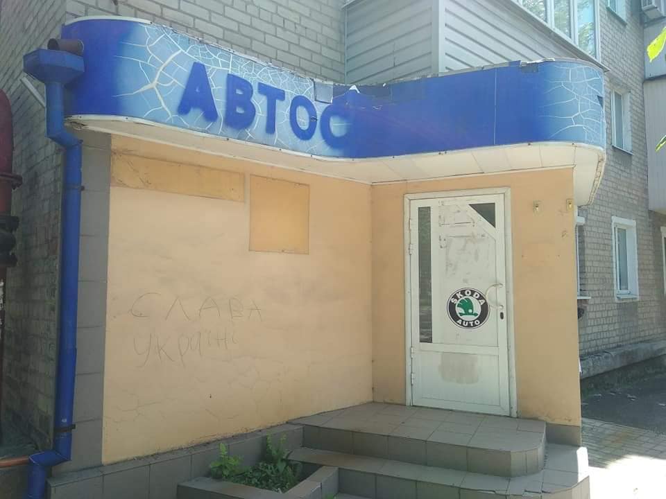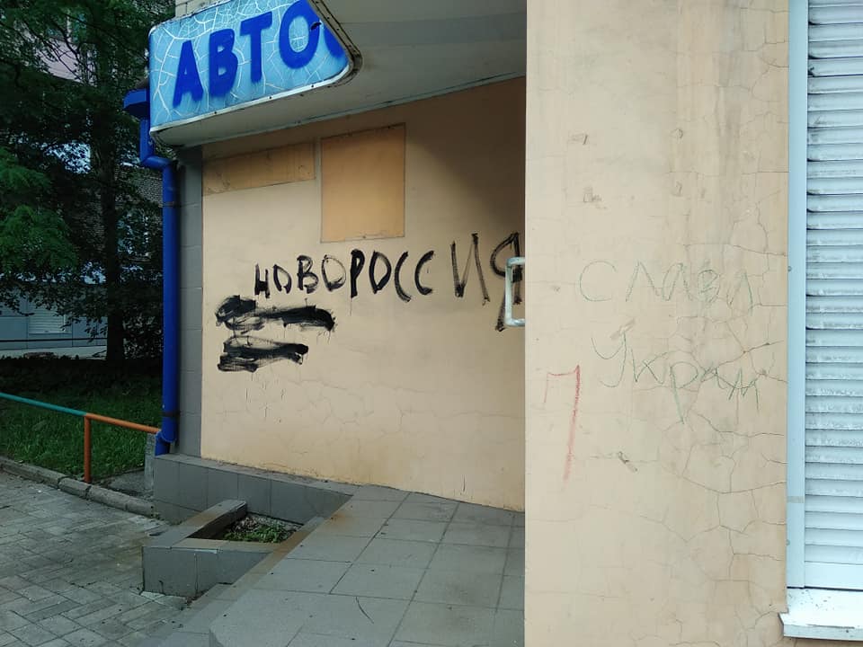 После этого фасад старого магазина, на котором была надпись «Слава Украине», испортили, закрасив надпись черной краской и дописав «Новороссия». Однако рядом появились еще одни слова «Слава Украине».