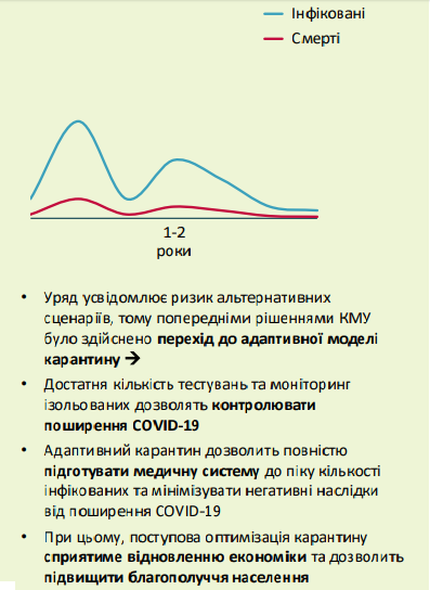 Все сценарии Кабмин рассматривал исходя из того, что пандемия продлится до двух лет. Первый сценарий предполагал полную отмену карантина. В таком случае, по оценкам правительства, число случаев заражения и количество смертей резко бы взлетели в несколько раз. Хотя этот сценарий наиболее благоприятный для экономики страны.
