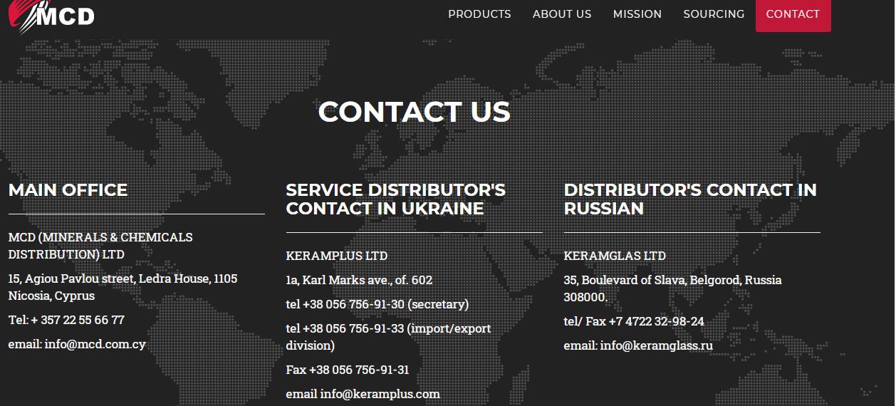 ТОВ “Керамплюс” — торговая компания, которая специализируется на продаже сырья металлургической, литейной, машиностроительной, стекольной и огнеупорной промышленности. Именно там применяется продукция ВГМК по всему миру. ООО “Керамплюс” входит в сеть глобальных офшоров MCD LTD (Mineral&Chemicals Distribution) с главным офисом на Кипре.