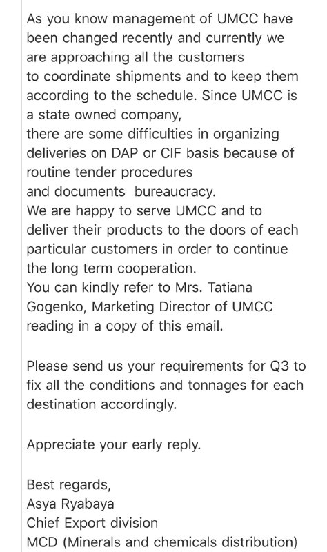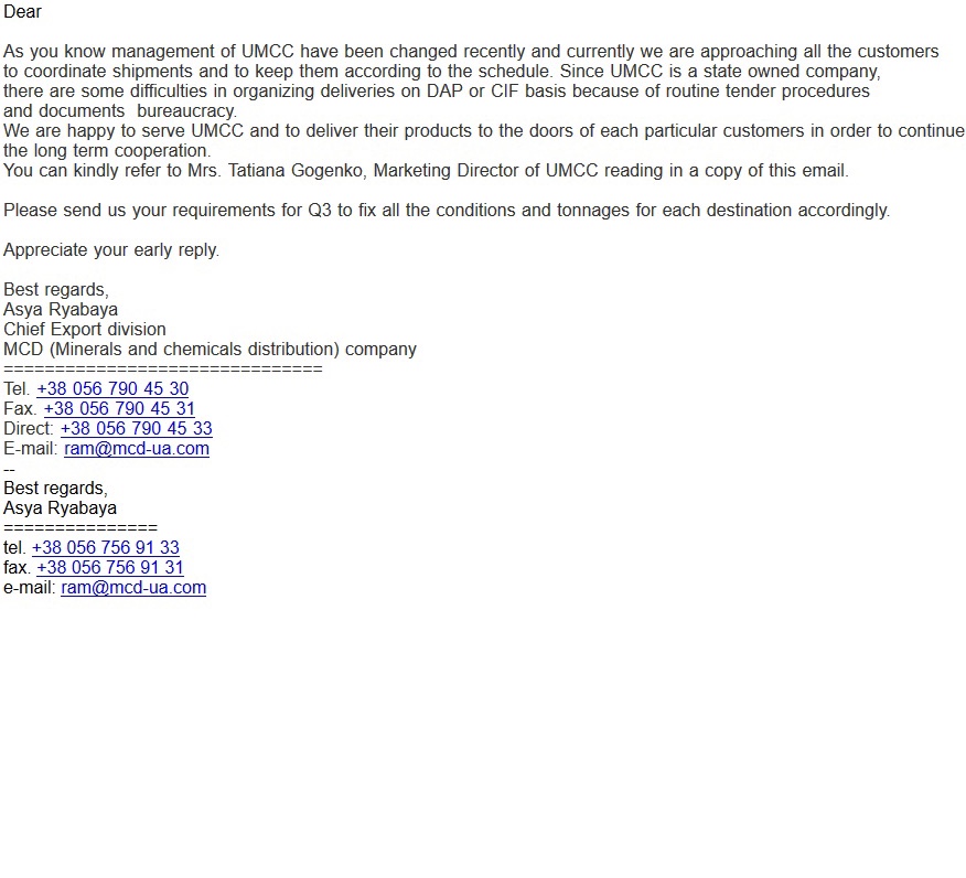 Представители MCD LTD и IIMCO Trade PTE.LTD в настоящее ведут переписку с конечными потребителями продукции ОГХК о ее приобретении в координации с членом правления АТ “ОГХК” Татьяной Гогенко. Они предлагают к осмотру образцы продукции. Таким образом, компании Кучука пытаются завести себе положительное реноме на рынке.