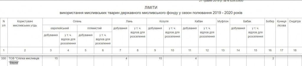 Зазначимо, що, згідно наказу Мінагрополітики від 21 травня 2019 року № 529/33500, для ТОВ “Спілка мисливців “Фауна” були затверджені наступні ліміти використання мисливських тварин державного мисливського фонду у сезон полювання 2019 – 2020 років: 15 європейських оленів, 4 лані, 15 козуль, 4 кабани, 2 бобри.