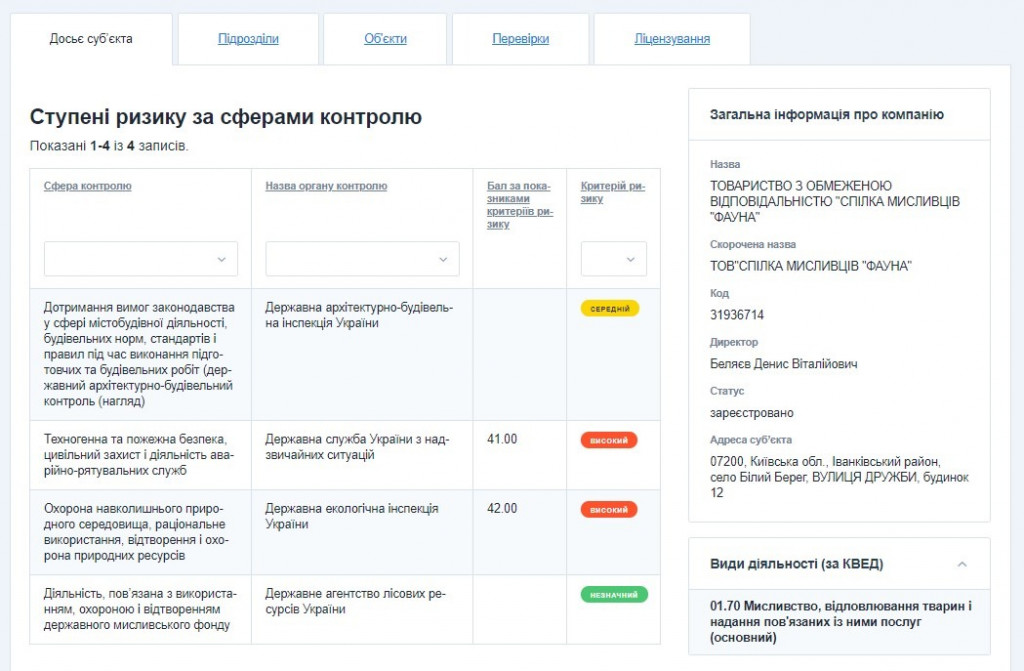 За даними аналітичної системи YouControl, ТОВ “Спілка мисливців “Фауна” (*) засновано в 2002 році в селі Білий Берег Іванківського району зі статутним капіталом в 16,5 тис. гривень. Його керівник – Денис Бєляєв, засновник – уродженець Дніпра Геннадій Буткевич.