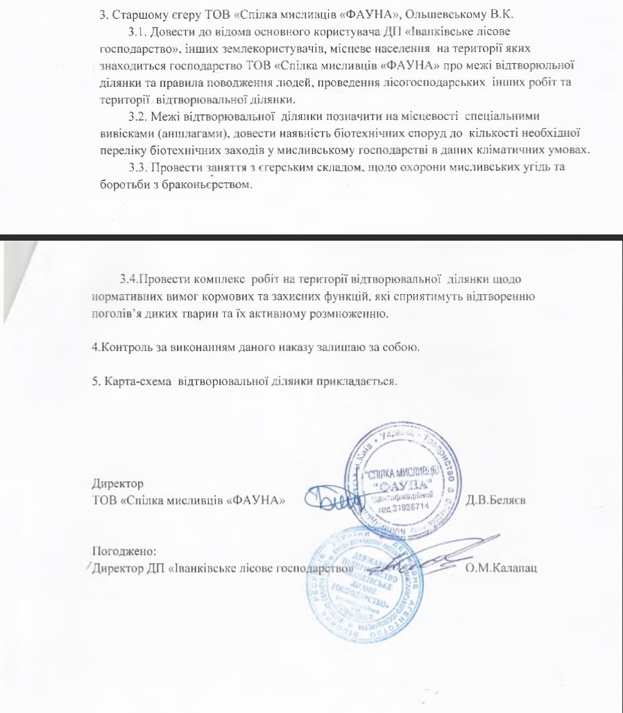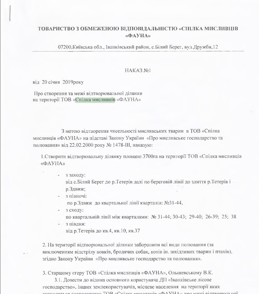 Як стало відомо KV, 21 грудня 2017 року Іванківська районна рада ухвалила рішення № VІІ-30/372 згідно із яким “Фауні” надавалося 11 043 га угідь у користування строком на 49 років. Для отримання землі мисливське господарство зобов’язали відшкодовувати збитки за пошкоджені сільськогосподарські посіви, які були заподіяні мисливськими тваринами сільгоспвиробникам та селянським господарствам. Крім цього, ТОВ поставили умови по наданню можливості безкоштовного колективного полювання місцевим мисливцям на території відповідних угідь, а також попросили не перешкоджати вільному доступу місцевого населення в ліс у будь-яку пору року на всій території мисливських угідь.