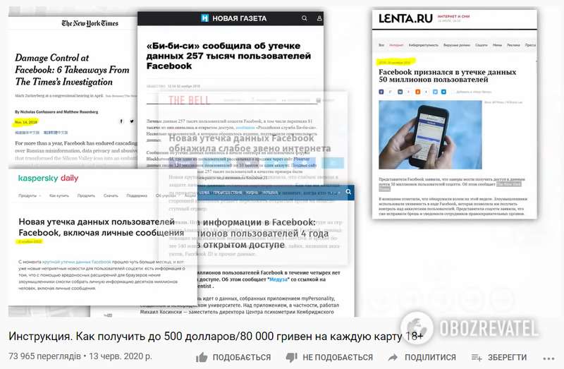 Для доказательства своих слов автор опубликовал реальные скриншоты с мировых и украинских СМИ об утечках. Однако там речь идет только о скандалах, когда сервисы теряли данные о сотнях миллионов аккаунтов пользователей. И нет ни слова о компенсации. Впрочем, это человека за кадром не смутило.