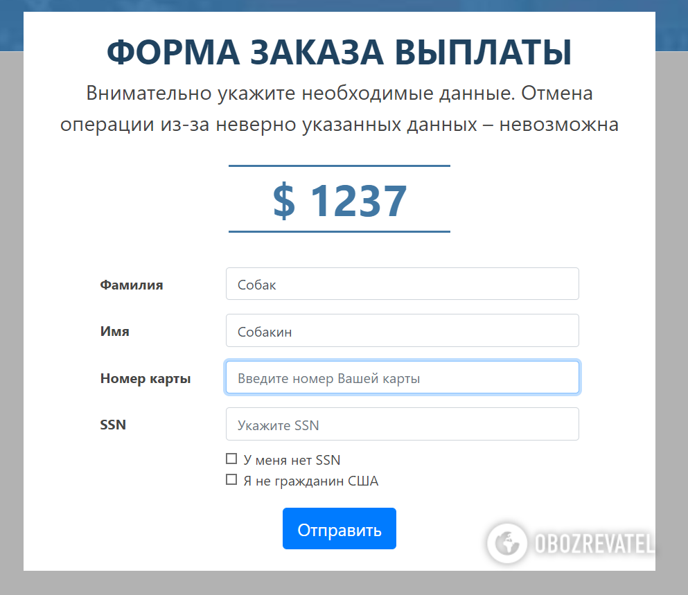 Дальше начался главный этап мошеннической схемы. Нам предложили забрать деньги. Для этого нужно было указать номер банковской карты и SSN (Social Security number) – американский номер социального страхования. Понятно, что у не граждан (и не резидентов) США его нет.