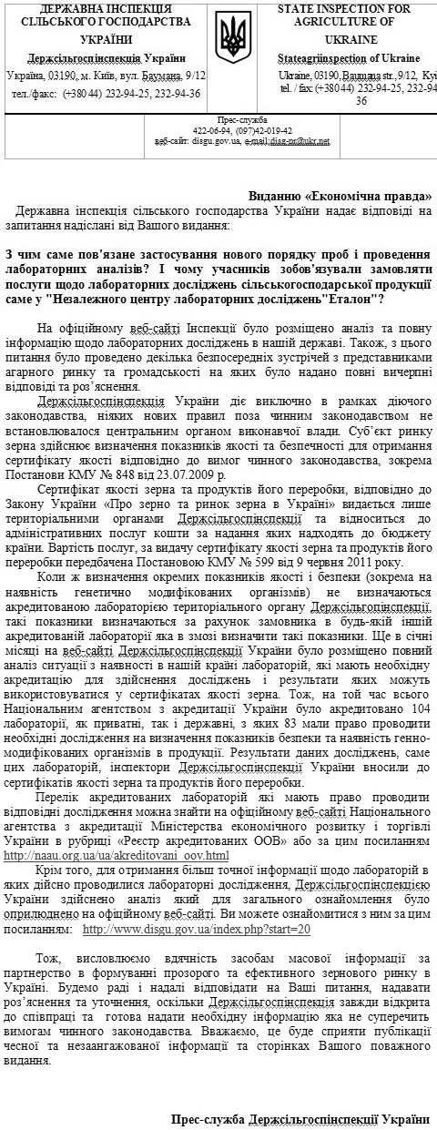 Як видно з листа, Держсільгоспінспекція дала зрозуміти, що замовляти аналізи з якості зерна можна лише у конкретної компанії. Там же було сказано, що треба додатково платити 9,6 грн за тонну. Хто відмовлявся - стикався з проблемами.