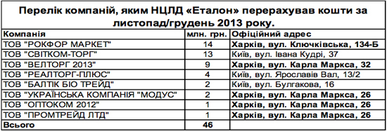 Що ж відбувалося з отриманими "Еталоном" коштами? Як свідчать його документи стосовно операцій з ПДВ, гроші на рахунках довго не затримувалися. Тільки за останні два місяці 2013 року "Еталон" перерахував сімом компаніям, що займаються оптовою торгівлею, близько 46 млн грн.