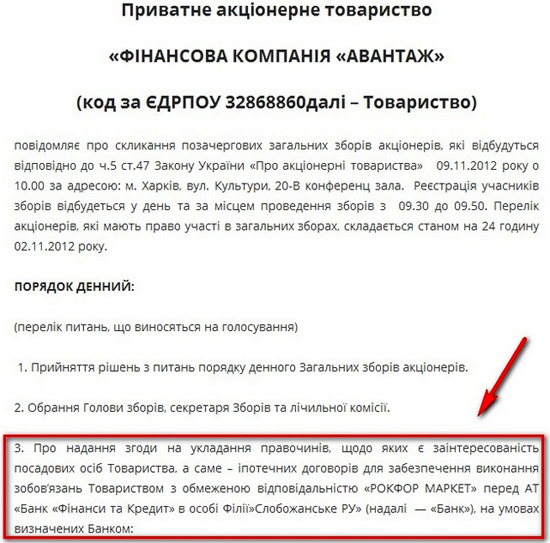 У мережі можна знайти порядки денні зборів акціонерів "Фінансової компанії "Авантаж" за 2012 рік, де розглядаються питання щодо укладання іпотечних угод для забезпечення зобов’язань "Рокфор маркет" перед комерційними банками.