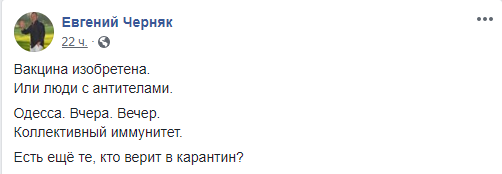 "Вакцина изобретена. Или люди с антителами. Одесса. Вчера. Вечер. Коллективный иммунитет. Есть ещё те, кто верит в карантин?" - написал он.