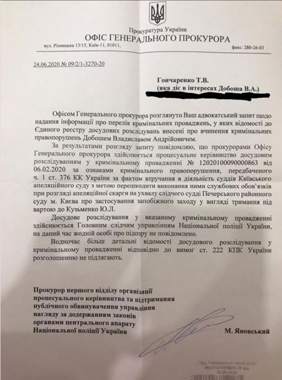 «Наконец-то получил хоть какую-то официальную информацию об открытом против меня деле, связанном с заседанием по делу Шеремета. Квалифицировали по ч.1 ст. 376 — это вмешательство в любой форме в деятельность судьи с целью помешать выполнению им служебных обязанностей или добиться вынесения неправосудного решения», — пишет адвокат на своей страничке в социальных сетях и публикует ответ Офиса генпрокурора на адвокатский запрос.