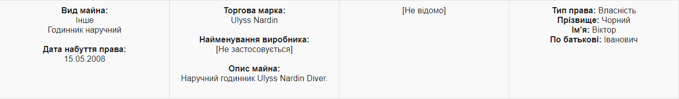 У власності парламентаря також є годинник Ulysse Nardin Diver. Чорний не вказав його вартість, але на профільних сайтах відповідний аксесуар можна придбати за 100-300 тисяч гривень.