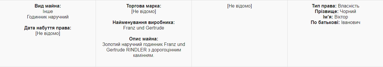 Крім того, соратник Медведчука задекларував золотий наручний годинник Franz und Gertrude RINDLER з дорогоцінним камінням.