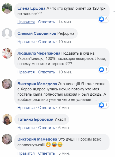 "Зашибись, вот гады, за билет в три дорога берут, а людей хуже скота возят", "Вот это да… дожили… а цены на билеты, пи…ц, стыдно", "Посадить бы туда чиновников! Пусть бы покатались!", "Жесть! "Укрзалізниця" офигела!", "Сарай!", "Да, реформы в действии", "Подавать в суд на "Укрзалізницю", 100% пассажиры выиграют. Люди, почему молчите и терпите?", "Это пипец! Я тоже ехала из Херсона, проснулась ночью,потому что моя постель была полностью мокрая и лил дождь. А вообще, реально уже ничего не удивляет", – пишут в сети.