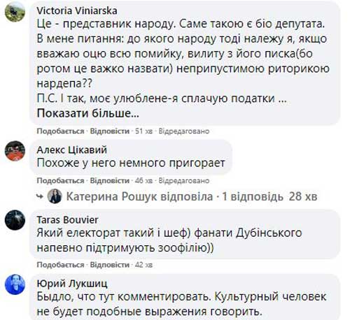 «Главный любитель собачьих ртов», «пи*деть не мешки ворочать, коэффициент вашего депутатства -100», «не к лицу, как для народного депутата. Не хочу такое читать от народного депутата. Потому так и живем. Быдло невоспитанное», — написали украинцы.