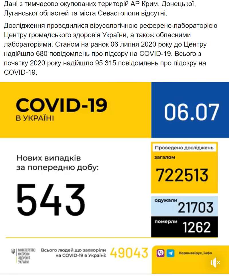 "6 июля (по состоянию на 9:00) в Украине 49 043 лабораторно подтвержденных случая COVID-19, из них 1262 летальных, 21 703 пациента выздоровели. За сутки зафиксировано 543 новых случая. Всего проведено 722 513 тестирований методом ПЦР", – говорится в посте.