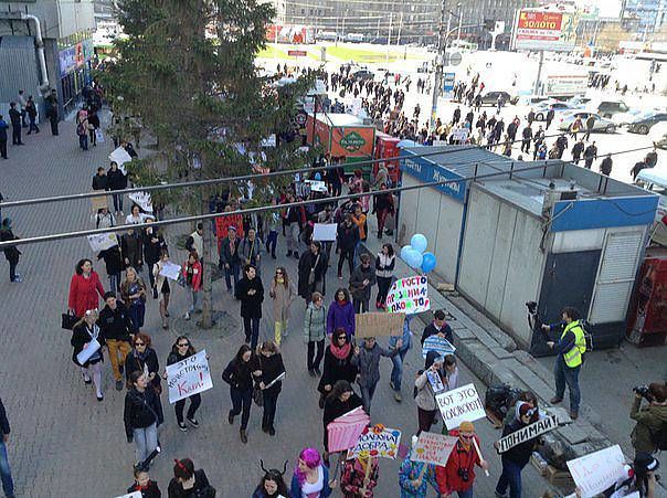 "Хочу предупредить, что появление в нашей колонне "монстрантных лозунгов и плакатов" будет совершенно неуместно и может вызвать бурную реакцию (!) участников нашего шествия", – сказал организатор колонны КПРФ Агеенко.