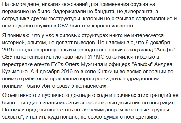 «Поражает уровень непрофессионализма сотрудников СБУ. Они устроили стрельбу в густонаселенном районе. А вы слышали про рикошеты? Вы понимаете, что можете убить того, кого хотите задержать? Понимаете, что могли попасть в других людей? Понимаете, к каким последствиям это могло привести? Вижу, что не понимаете», — пишет он.
