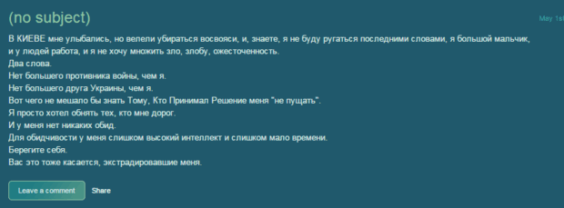 "В Киеве мне улыбались, но велели убираться восвояси, и, знаете, я не буду ругаться последними словами, я большой мальчик, и у людей работа, и я не хочу множить зло, злобу, ожесточенность. Два слова. Нет большего противника войны, чем я. Нет большего друга Украины, чем я. Вот чего не мешало бы знать Тому, Кто Принимал Решение меня "не пущать". Я просто хотел обнять тех, кто мне дорог. И у меня нет никаких обид. Для обидчивости у меня слишком высокий интеллект и слишком мало времени. Берегите себя. Вас это тоже касается, экстрадировавшие меня", - написал Кушанашвили.