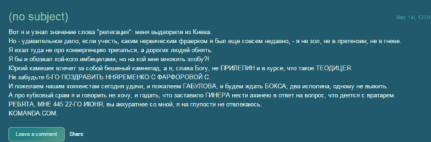 "Именно в Украине я веду себя так, как ребенок в Диснейленде. Там голову кружат девчонки, улыбающиеся не за деньги, там достижениям твоим хлопают, а не желают тебе летальности, фыркая, там не бурчат: "А мне чужих стихов не надо. Мне со своими тяжело", - рассказывал журналист в своем блоге.