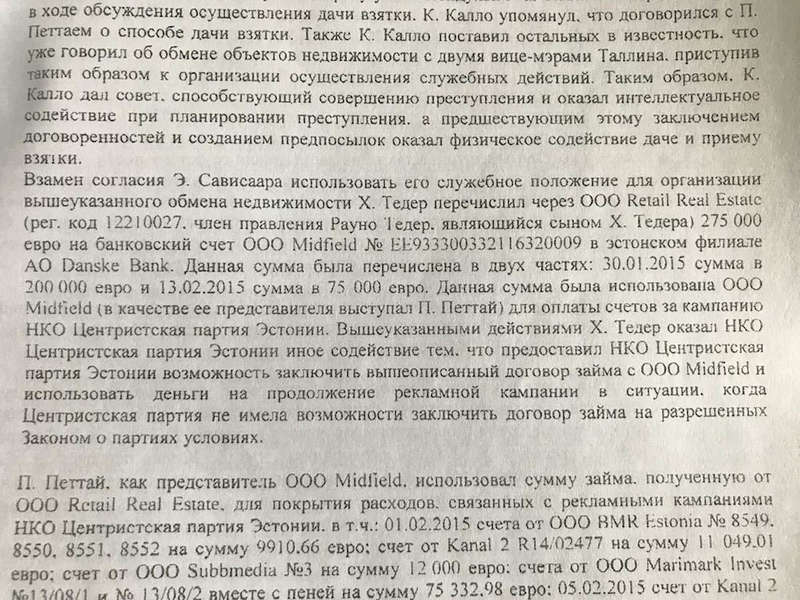Несмотря на то, что Тедер говорил о сложностях с деньгами, вскоре после встречи с мэром Таллина он поручил компании Retail Real Estate, которой руководит его сын Рауно, перечислить на счет Midfield деньги двумя траншами. И оказалось, что речь тут вовсе не шла о каких-то баснословных суммах: первый транш составил 200 тысяч евро, а второй – 75 тысяч. Кстати, мэр не брезговал и более мелкими подношениями ради решения вопросов других «ходоков»: ему оплачивали перелет и отдых в Испании с предоставлением личного автомобиля с водителем.