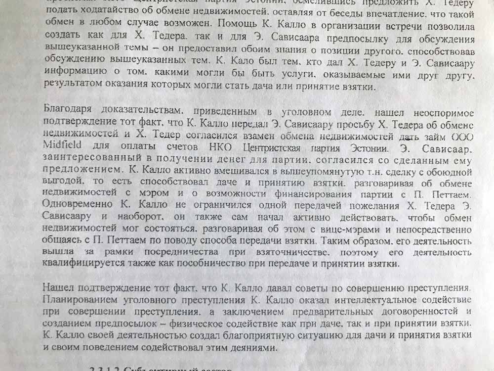 Уже на следующий день Калло и мэр в Таллина встретились в кабинете мэра. В материалах суда есть аудио-записи их разговора, на которых слышно, как Калло убеждает Сависаара отдать Тедеру городскую недвижимость в обмен на деньги, которых партии очень не хватало для проведения предвыборной рекламной кампании. Мэр согласился поговорить с Тедером.