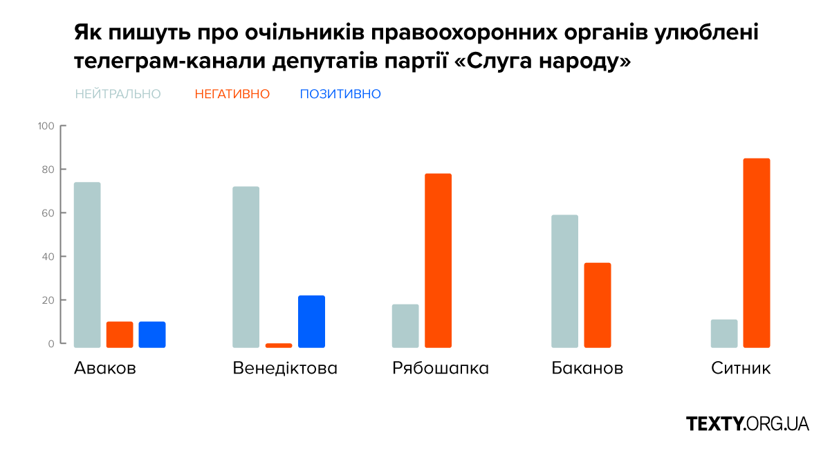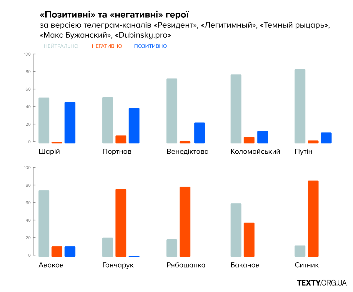 Например, о Рябошапке упоминали 264 раза, и почти всегда (80% сообщений) - в негативном свете, монотонно повторяя о необходимости его отставки. По версии администраторов телеграмм-каналов, «Генеральная прокуратура выполняет указания посольства США, а не Офиса Президента», а «все дела, которые полгода успешно разваливал Рябошапка, тянут на миллиарды гривен». Громкие обвинения обычно раздавались без всяких доказательств, зато с хорошей порцией отборной нецензурной брани.