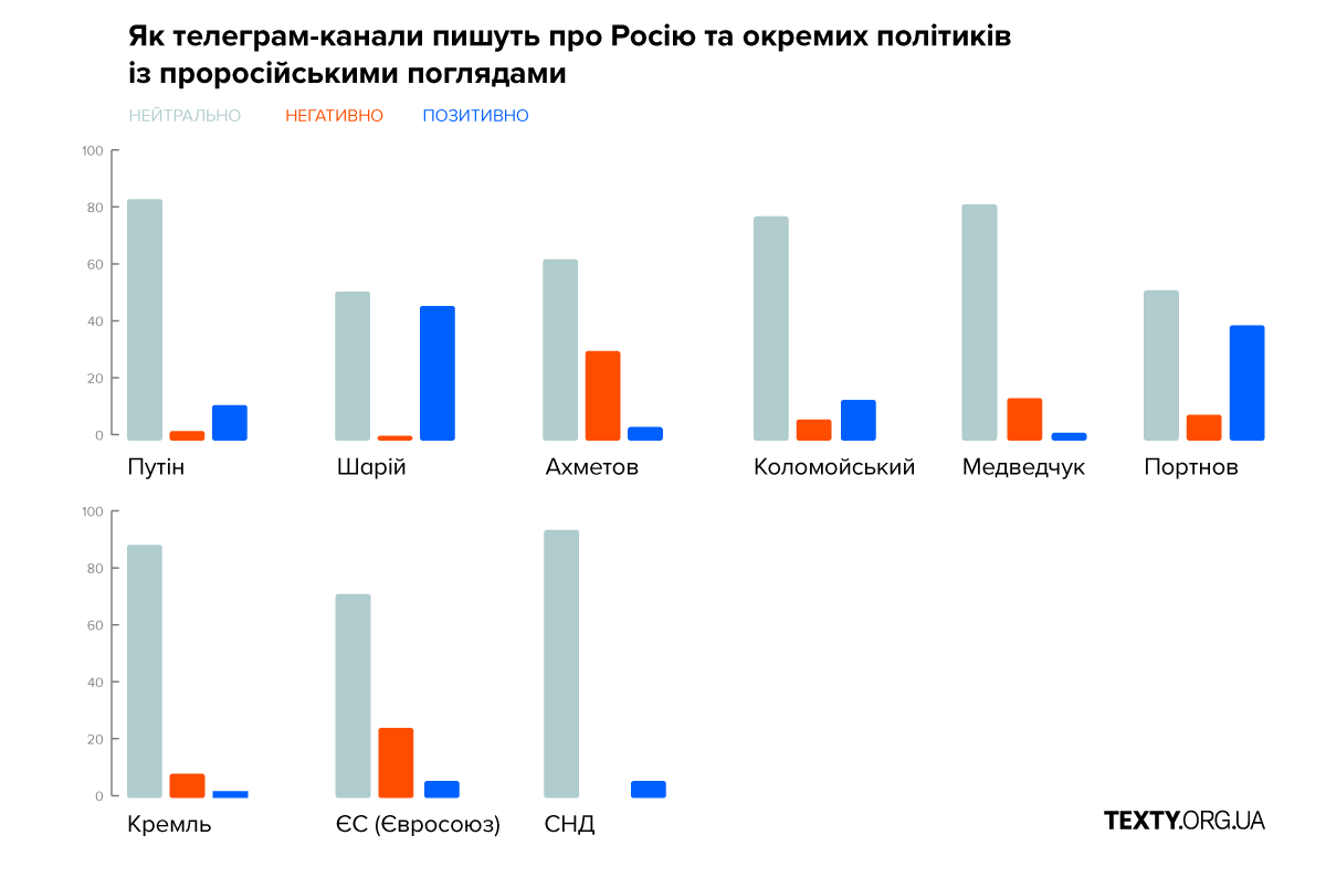 В исследованных нами телеграмм каналах особенно ярко выражена поддержка пророссийских политиков украинского происхождения. Например, об Анатолии Шарие пишут, как о покойнике: или хорошо (47%), или нейтрально (52%). Читателям внушают мысль, что Шарий «сильно независимый», «молодец», «как всегда, метко сказал» - и вообще, «партия Шария становится единственной альтернативой в Центре и на Юго-Востоке страны».