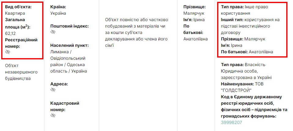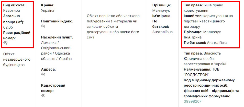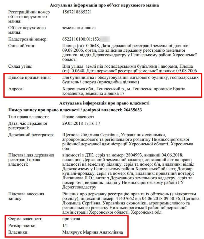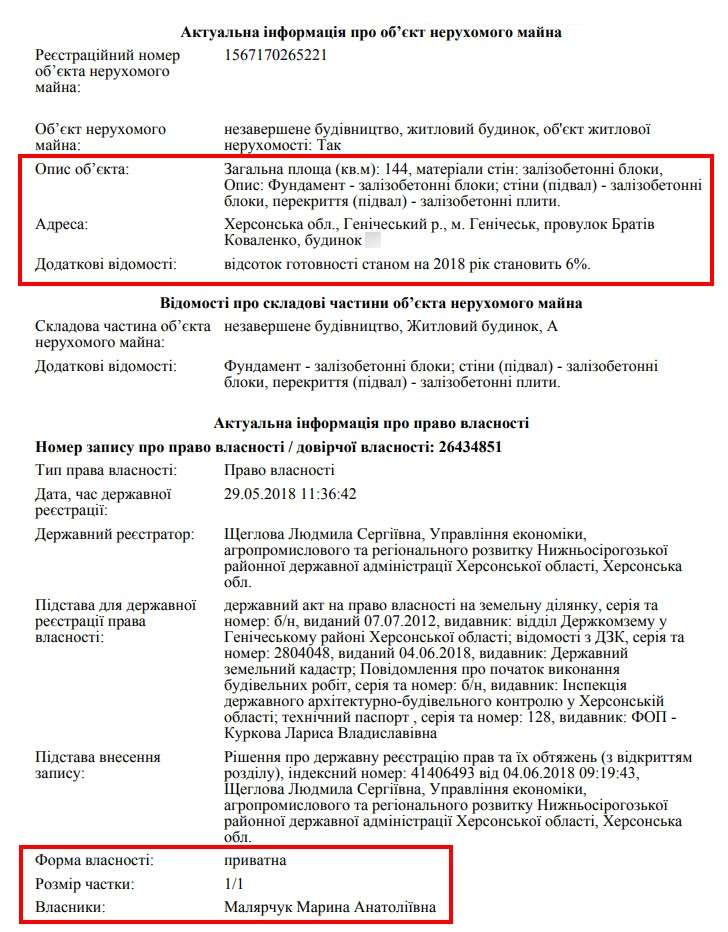 Дополнительно у Марины Малярчук есть приватизированный участок с недостроем в Геническе, недалеко от береговой линии. Согласно реестру, по состоянию на 2018 год объект был построен на 6%.