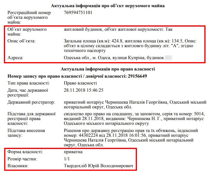 Муж судьи Юрий Твердохлиб до недавнего времени работал в следственном управлении финрасследований ГФС. Всего в органах налоговой службы Юрий Владимирович по меньшей мере с 2003 года. Он также оказался необделен наследием: дом с земельным участком площадью 424 кв. м в городе Одесса. К сожалению, стоимость проживания судья не захотела вписывать в свою декларацию, а Твердохлиб обошелся цифрой «1».