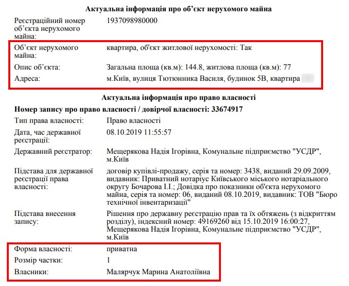 Пока бизнес выходит в ноль, Марина Малярчук скупает недвижимость. В прошлом году она зарегистрировала на себя квартиру площадью 144 кв. м в новостройке. Там же - машиноместо в подземном паркинге. Подобная квартира, по нашим подсчетам по профильным сайтам продажи недвижимости, может стоить 250 тысяч долларов.