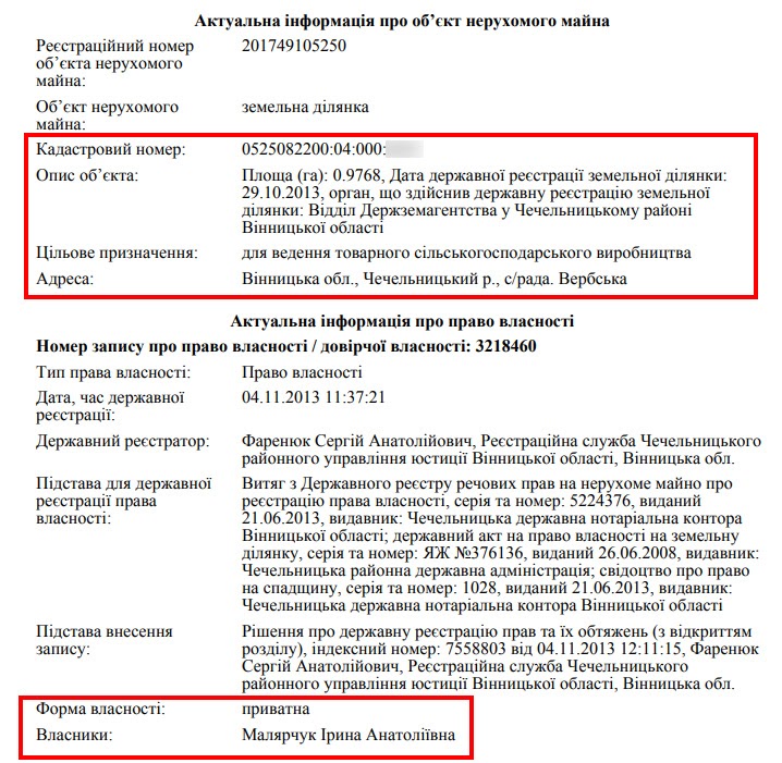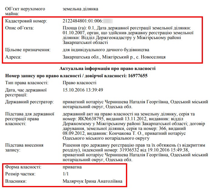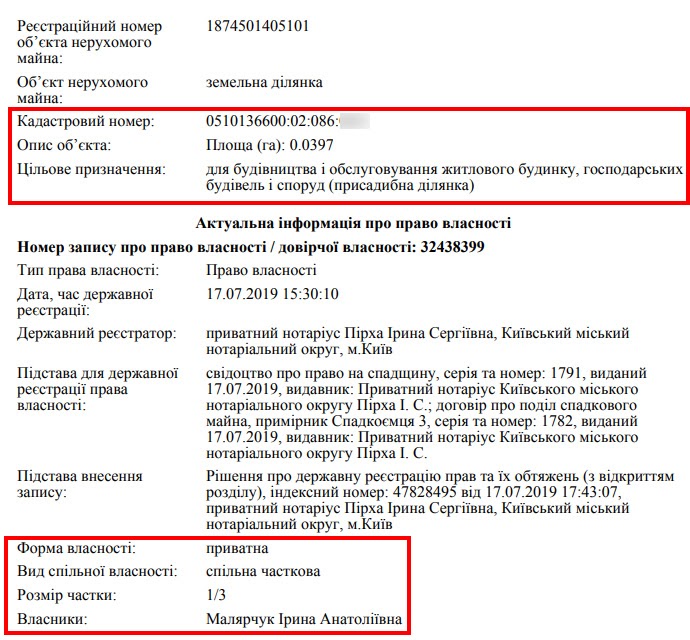Ирина Малярчук в свою имущественную декларацию за 2019 вписала пять земельных участков с достаточньо обширной географией: в Закарпатье, Винницкой области и Одессе. Однако не всеми ими она владеет единолично, один из них - ее мужа. В прошлом году судья вместе с сестрами Мариной и Ольгой получили в Виннице два наследственных земельных участка площадями 0,10 и 0,03 га.