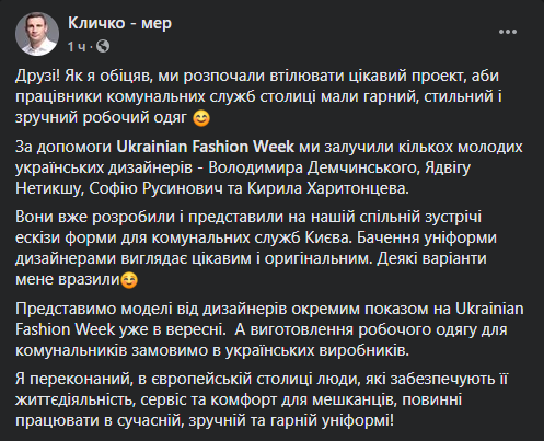 Стильную одежду для киевских коммунальщиков впервые покажут на сентябрьском показе Ukrainian Fashion Week. После этого новую форму закажут оптом у отечественных производителей.