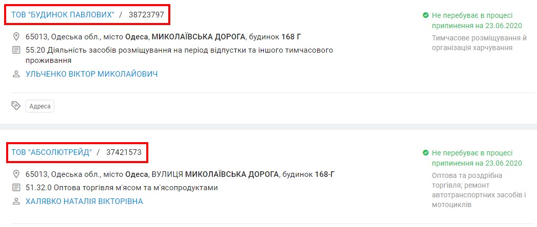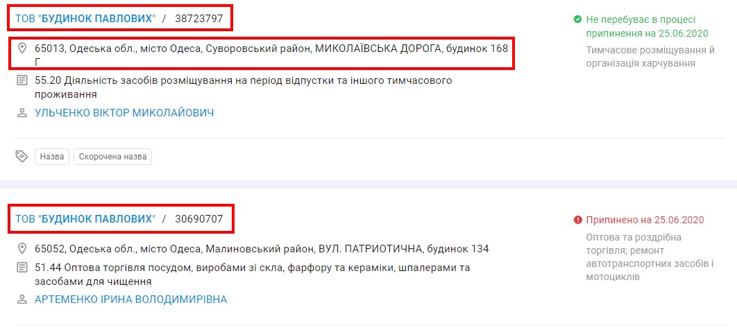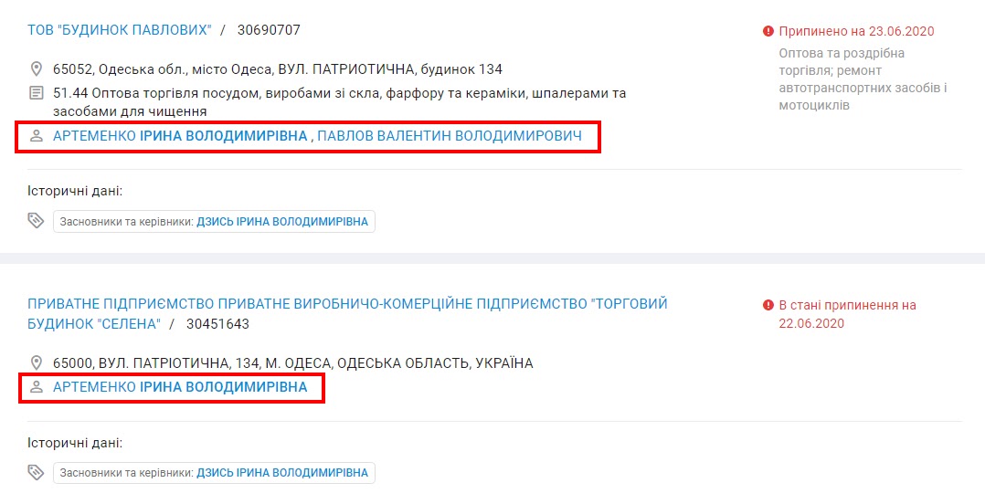По декларации родственных связей, тесть Артеменко Валентин Павлов индивидуальный адвокат с 2013 года, но на портале «Судебная власть» мы не нашли дел, где Павлов выступал бы защитником. Свою деятельность осуществляет по адресу Николаевская дорога, 168. Там, на побережье, расположен уже упоминавшийся гостиничный комплекс «Дом Павловых», состоящий из больших жилых и нежилых помещений. Земельными участками под ними владеет теща Анна Павловна. Оба основали уже упомянутое ООО «Дом Павловых», где работала их дочь Ирина Артеменко, и которое сейчас приостановлено. В ЕГР мы также нашли действующее общество с пропиской на территории отеля, но с минусовой чистой прибылью.