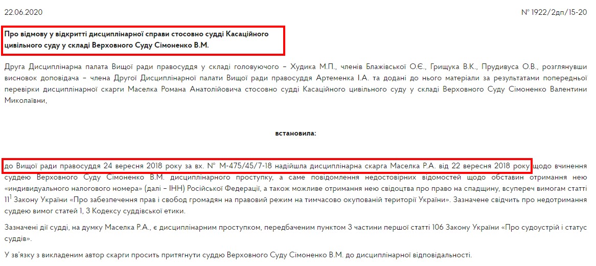Похожая история произошла и с судьей Верховного Суда Валентиной Симоненко, жалоба на которую около двух лет пылилась. В 2018 году оказалось, что у нее есть налоговый номер Российской Федерации. Когда возник скандал, Симоненко сказала, что это просто оккупанты использовали старые базы данных и автоматически присвоили ей номер. Но это не могло быть правдой, потому что этот номер бил выдан на паспорт Симоненко, который она получила в 2015 году. То есть кто-то должен был предоставить агрессорам ее новые данные. Эта очевидная ложь и стала основанием для жалобы. Но с рассмотрением медлили. Лишь после того, как жалобщик обратился в суд на очевидное затягивание, Артеменко вынес жалобу на рассмотрение и просил в открытии производства отказать. Палата поддержала его и решила, что в действиях Симоненко нет никаких нарушений.