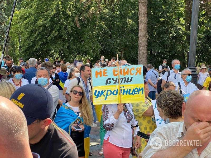В то же время под Верховной Радой второй день проходила акция протеста против законопроекта Бужанского. Участники разложили большой плакат на земле с надписью "Руки прочь от закона о языке" и зажгли под зданием парламента костер.