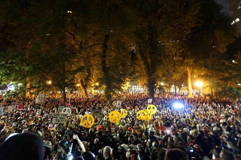 При этом в соседнем со зданием суда сквере проходил мирный митинг, в котором участвовали несколько тысяч человек. В ходе акции выступил мэр Портленда, который обещал провести реформу полиции, однако так как его было плохо слышно, толпа не восприняла его речь.