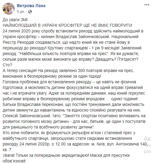 Именно в комментариях под постом с анонсом события Ветрова рассказала, что мальчик сделал 430 повторов упражнения на пресс в непрерывном режиме и стал рекордсменом Украины.