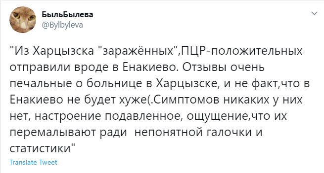 «Из Харцызска „зараженных“, ПЦР-положительных отправили вроде в Енакиево. Отзывы очень печальные о больнице в Харцызске, и не факт, что в Енакиево не будет хуже (.Симптомов никаких у них нет, настроение подавленное, ощущение, что их перемалывают ради непонятной галочки и статистики»