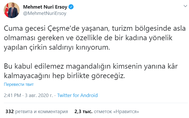 "Я осуждаю ужасное нападение в Чешме в пятницу вечером, этого не должно быть в туристическом районе, особенно в отношении женщины", – написал он.