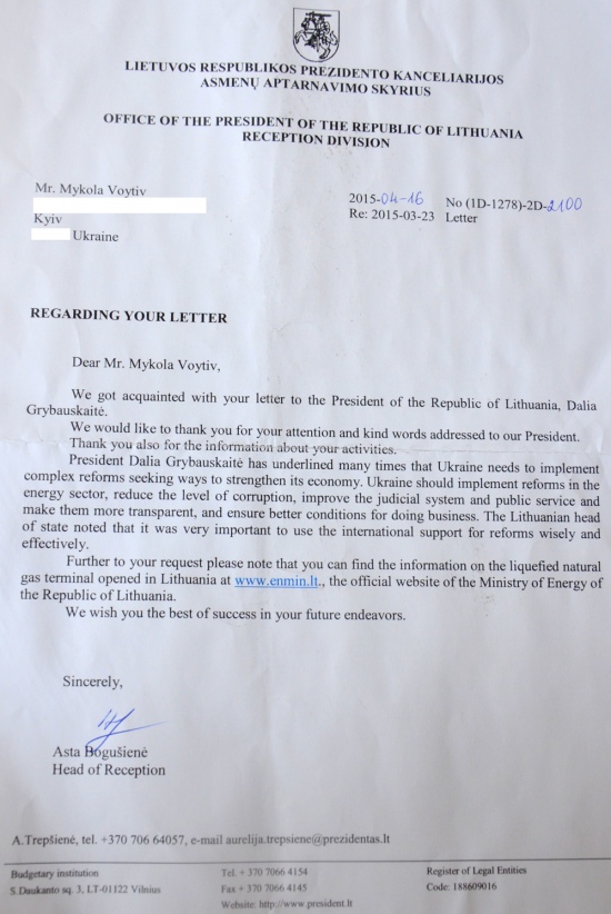 У рамках навчання у бізнес-школі в Латвії та магістерської роботи на тему енергетичної незалежності України я написав листа президенту Литви, у якому наголосив на важливості литовського досвіду для України. Отримав таку відповідь.