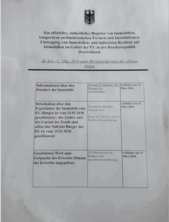 В выписке из реестра недвижимости ФРГ указано, что по состоянию на март 2018 года Гoлoдницкий владеет квартирой в Дюссельдорфе стоимостью 230 тысяч евро. При этом его жена имеет два дома в Мюнхене стоимостью 198 тысяч евро.