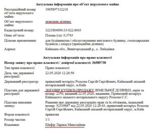 Крім того, Лариса Шефір у травні зареєструвала право власності на куплену ділянку площею 0,37 га у с. Лебедівка.
