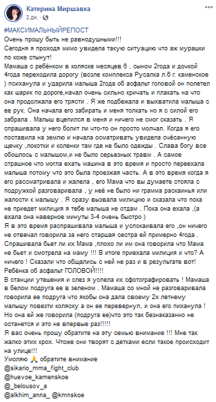 "Когда я его поставила на землю и начала осматривать, увидела счесанную щечку, локотки и коленки там, где не было одежды. Слава богу, все обошлось с малышом и не было серьезных травм. Но самое страшное, что могла ехать машина в это время и просто переехала бы малыша, потому что это была проезжая часть", – отметила автор поста.