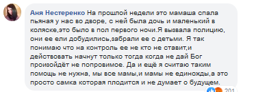 "На прошлой неделе эта мамаша спала пьяная у нас во дворе, с ней была дочь и маленький в коляске, это было в половине первого ночи. Я вызвала полицию, они ее еле добудились, забрали ее с детьми".